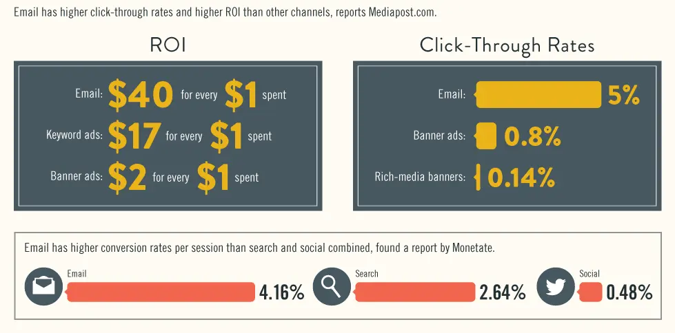 However, a recent infographic by email testing and analytics service Litmus, reveals that email marketing averages an ROI of $40 for every $1 spent. Not bad at all!