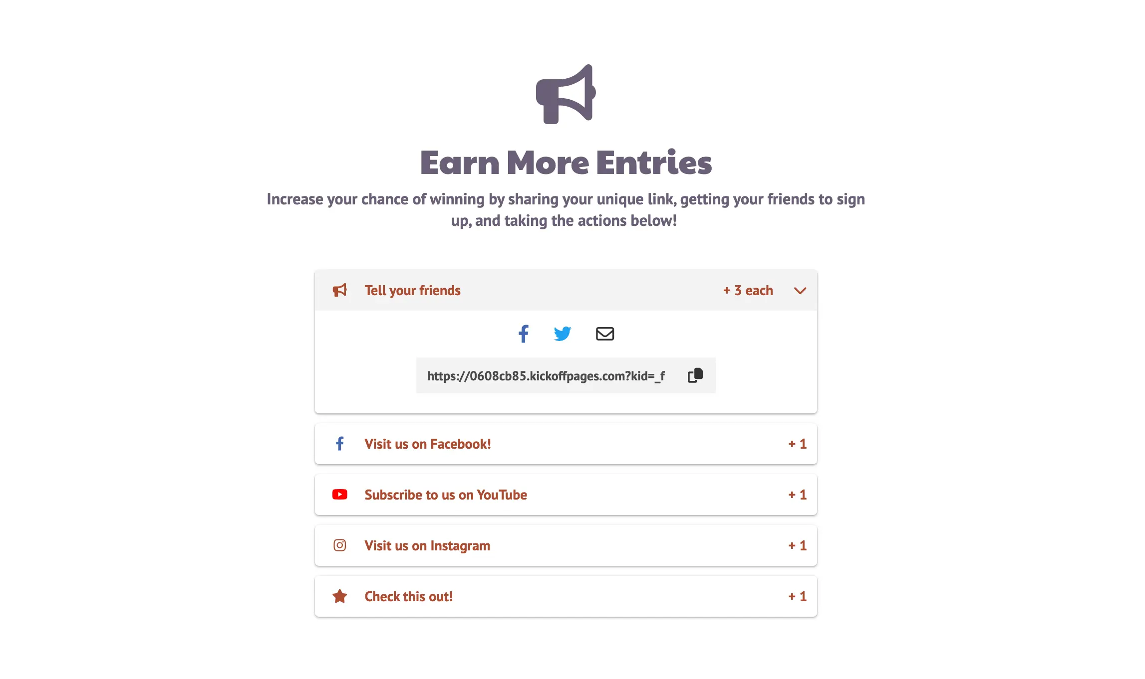 Online giveaways are even more rewarding with KickoffLabs! Our giveaways are designed to multiply the impact of every entry. Participants feel rewarded when they enter so they organically spread your contest throughout their network. We make it easy to increase your traffic, boost conversions, and expand your reach, all while helping users feel valued. Explore KickoffLabs and get started with our viral giveaway services today or email our support team support@kickofflabs.com to learn more!