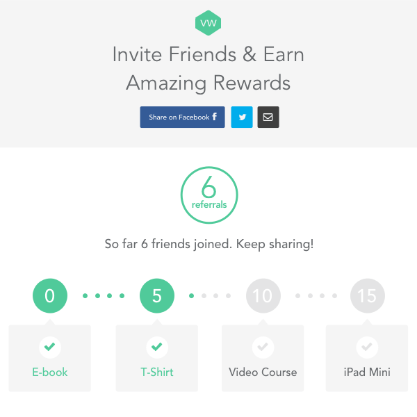 A single reward could be the referral of your project to ten friends. A multiple reward could be layered, where leads unlock each subsequent ‘bigger’ reward by reaching increasingly higher milestones. The first reward could be a free ebook just for signing up, the second a t-shirt for referring your project to ten people, the third could be your full product for getting twenty people to sign up for your newsletter.