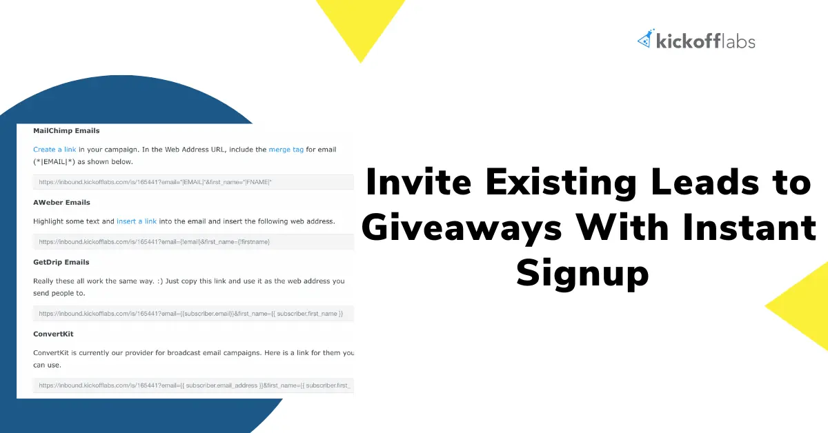 Every KickoffLabs campaign generates a special instant signup URL. When you append a lead's email address to this URL, clicking it automatically enrolls them in your contest and generates their unique referral link. There is no form to fill out and no extra steps. This removes the biggest friction point when inviting your existing audience into a new campaign.